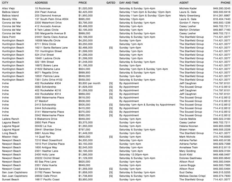 Aliso Viejo 15 Rockrose $1,020,000 Saturday & Sunday 1pm-4pm Michele Kader 949.280.3245 Balboa Island 204 Pearl Avenue $2,425,000 Saturday 11am-2pm & Sunday 12pm-3pm Laura G. Gale 949.500.6418 Balboa Island 203 Diamond Avenue $1,950,000 Saturday 11am-2pm & Sunday 12pm-3pm Marty Greenberg 914.261.6867 Beverly Hills 137 South Palm Drive #304 $995,000 Saturday 12pm-4pm Laura G. Gale 818.404.7440 Corona del Mar 2200 Waterfront Drive $3,795,000 Saturday & Sunday 1pm-4pm Gordon F. Henry 949.500.1236 Corona del Mar 412 Avocado Avenue $3,499,000 Saturday 1pm-4pm Casey Lesher 949.702.7211 Corona del Mar 8 Twin Lakes Circle $2,195,000 Saturday 1pm-4pm Marilyn Christian 949.887.7160 Corona del Mar 330 Marguerite Avenue B $999,000 Saturday & Sunday 1pm-4pm Casey Lesher 949.702.7211 Dana Point 24401 Santa Clara Avenue $3,199,000 Saturday & Sunday 1pm-4pm The Stanfield Group 714.421.3377 Huntington Beach 16356 Maruffa Circle $4,250,000 Sunday 1pm-5pm The Stanfield Group 714.421.3377 Huntington Beach 6711 Shire Circle $3,250,000 Saturday 1pm-4pm The Stanfield Group 714.421.3377 Huntington Beach 16211 Santa Barbara Lane $2,488,000 [G] Sunday 1pm-5pm The Stanfield Group 714.421.3377 Huntington Beach 701 Huntington Street $1,599,000 Saturday 1pm-5pm The Stanfield Group 714.421.3377 Huntington Beach 524 21st Street $1,299,000 Saturday 1pm-4pm The Stanfield Group 714.421.3377 Huntington Beach 16461 Ladona Circle $1,299,000 Saturday 1pm-5pm The Stanfield Group 714.421.3377 Huntington Beach 322 18th Street $1,248,000 Saturday & Sunday 1pm-5pm The Stanfield Group 714.421.3377 Huntington Beach 16972 Bolero Lane $1,195,000 Sunday 1pm-5pm The Stanfield Group 714.421.3377 Huntington Beach 21622 Bahama Lane $924,000 Saturday 1pm-5pm & Sunday 1pm-4pm The Stanfield Group 714.421.3377 Huntington Beach 9071 Regatta Drive $899,900 Saturday & Sunday 1pm-4pm The Stanfield Group 714.421.3377 Huntington Beach 16531 Patricia Lane $649,000 Sunday 1pm-4pm The Stanfield Group 714.421.3377 Huntington Beach 7351 Coho Drive #102 $559,000 Saturday & Sunday 1pm-4pm The Stanfield Group 714.421.3377 Irvine 402 Rockefeller #304 $3,600 per month [G] By Appointment Jeff Caughren 714.797.6151 Irvine 3082 Scholarship $1,628,000 [G] By Appointment The Soussé Group 714.412.8512 Irvine 402 Rockefeller #216 $1,059,000 [G] By Appointment Jeff Caughren 714.797.6151 Irvine 402 Rockefeller #314 $869,000 [G] By Appointment Jeff Caughren 714.797.6151 Irvine 3265 Watermarke Place $618,000 [G] By Appointment The Soussé Group 714.412.8512 Irvine 27 Waldorf $508,000 By Appointment The Soussé Group 714.412.8512 Irvine 2413 Scholarship $505,000 [G] Saturday 1pm-4pm & Sunday by Appointment The Soussé Group 714.412.8512 Irvine 2444 Scholarship $415,000 [G] By Appointment The Soussé Group 714.412.8512 Irvine 3141 Watermarke Place $375,000 [G] By Appointment The Soussé Group 714.412.8512 Irvine 3342 Watermarke Place $365,000 [G] By Appointment The Soussé Group 714.412.8512 Ladera Ranch 9 Blakemore Drive $949,000 Sunday 1pm-4pm Carole Meikle 949.322.3183 Laguna Beach 2850 Park Place $3,375,000 Sunday 1pm-4pm Casey Lesher 949.702.7211 Laguna Niguel 30432 La Vue $1,350,000 Sunday 1pm-4pm Helena Noonan 949.903.0306 Laguna Niguel 28441 Sheridan Drive $797,000 Saturday & Sunday 1pm-4pm Shawn Halan 949.505.2226 Long Beach 5991 Azure Way $1,449,000 Sunday 1pm-5pm The Stanfield Group 714.421.3377 Mission Viejo 14 Quail Run $900,000 [G] Sunday 1pm-4pm Mark Nichols 310.745.8300 Newport Beach 7210 West Oceanfront $4,300,000 Saturday 1pm-4pm Adriana Farfan 949.400.9136 Newport Beach 1615 Port Charles Place $3,150,000 Sunday 1pm-4pm Adriana Farfan 949.929.7098 Newport Beach 1600 Antigua Way $2,545,000 Saturday 1pm-4pm Annaliese Train 949.812.8113 Newport Beach 2331 Heather Lane $2,195,000 Saturday 1pm-4pm Mary Golding 949.929.3184 Newport Beach 2430 Holly Lane $1,395,000 Saturday 12:30pm-4pm Scott Kidd 949.498.0487 Newport Beach 20222 Orchid Street $1,129,000 Saturday & Sunday 1pm-4pm Dolores Gastineau 949.933.9842 Newport Beach 60 Sea Pine Lane $825,000 Sunday 1pm-4pm Allison Root 949.300.5484 Newport Beach 2331 Vista Huerta $649,000 Sunday 1pm-4pm Lance Boggs 949.500.7565 Newport Coast 23 Saraceno $1,359,000 [G] Sunday 1pm-4pm Allison Root 949.300.5484 San Juan Capistrano 31762 Paseo Terraza $1,858,000 [G] Saturday & Sunday 1pm-4pm Suzi Dailey 949.315.5255 San Juan Capistrano 28502 Calle Pinon $1,738,800 [G] Saturday & Sunday 1pm-4pm Melissa Davies-Crispi 949.374.7830 Sunset Beach 16617 Pacific Coast $3,950,000 Sunday 1pm-4pm The Stanfield Group 714.421.3377