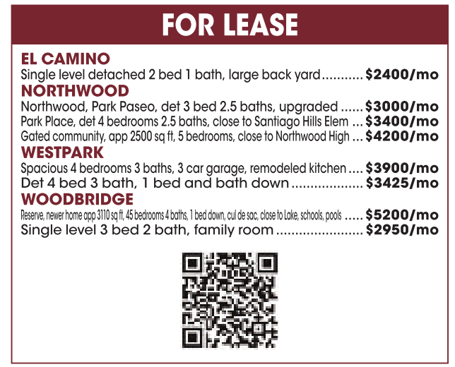 FOR LEASE EL CAMINO Single level detached 2bed 1bath, large back yard...........$2400/mo NORTHWOOD Northwood, Park Paseo, det 3bed 2.5 baths, upgraded ......$3000/mo Park Place, det 4bedrooms 2.5 baths, close to Santiago Hills Elem ...$3400/mo Gated community, app 2500 sq ft, 5bedrooms, close to Northwood High ...$4200/mo WESTPARK Spacious 4bedrooms 3baths, 3car garage, remodeled kitchen....$3900/mo Det 4bed 3bath, 1bed and bath down................... $3425/mo WOODBRIDGE Reserve, newer home app 3110 sq ft, 45bedrooms 4baths, 1bed down, cul de sac, close toLake, schools, pools .....$5200/mo Single level 3bed 2bath, family room ....................... $2950/mo