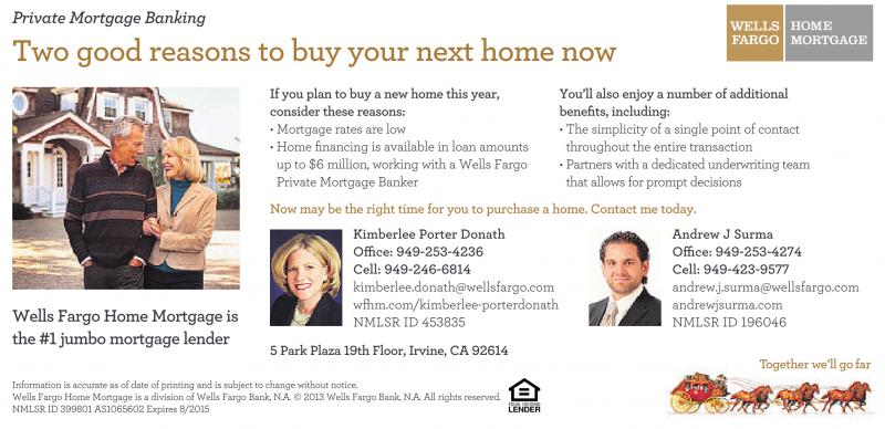 If you plan to buy a new home this year, consider these reasons: • Mortgage rates are low • Home financing is available in loan amounts up to $6 million, working with a Wells Fargo Private Mortgage Banker