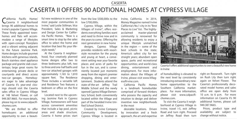 Pacific homes’ Caserta II neighborhood brings 90 additional homes to Irvine’s popular Cypress Village. These finely appointed townhomes and flats will accommodate a range of lifestyles with open-concept floorplans and a vibrant setting adjacent to the future Jasmine Park. home designs include gourmet kitchens with generous islands, Bosch stainless steel appliance package and graniteslab countertops; large great rooms for entertaining; private decks or courtyards and direct access two-car garages. homebuyers eager to take advantage of Caserta II’s year-end closings should visit the Caserta sales office in Cypress Village at 148 Velvet Flower, or call 949.387.9665. Formoredetails, please log on to www.calpacifichomes.com.