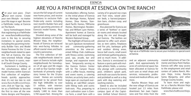 Savvy homeshoppers know thatregistering as aPathfinder on www.ranchomissionViejo. com is the key to securing invitations to special events, including the upcoming inviteonly Builder Fairs and model home Previews for the 12 new neighborhoods slated to open this Fall at esencia, the new view-oriented hillside village on The ranch in scenic, nearit-all South Orange County.