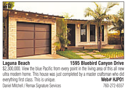 $2,300,000. View theblue Pacific from every pointinthe living area of this allnew ultra modern home. This housewas just completed by amaster craftsman whodid everything first class. This is unique. Web# HJPO1 Daniel Mitchell /Remax SignatureServices 760-272-6557