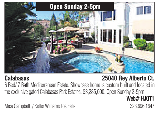 Open Sunday 2-5pm Calabasas 25040 ReyAlberto Ct. 6Bed/ 7Bath MediterraneanEstate.Showcasehome is custom built andlocated in the exclusive gated Calabasas Park Estates. $3,285,000. Open Sunday2-5pm Web# HJQT1 Mica Campbell /Keller Williams LosFeliz 323.696.1647 See also