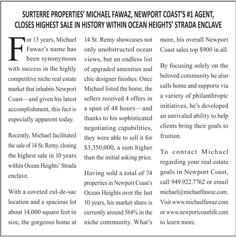 13 years, Michael Fawaz’s name has been synonymous with success in the highly competitiveniche real estate market that inhabitsNewport Coast—and given his latest accomplishment, this fact is especially apparent today.