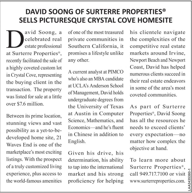 Soong, a celebrated real estate professional at Surterre Properties ® , recently facilitatedthe saleof a highly coveted custom lot in Crystal Cove,representing the buying client in the transaction. The property was listed for sale at a little over $7.6 million.