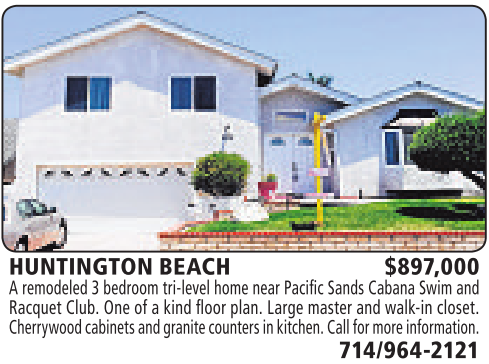 HUNTINGTON BEACH $897,000 Aremodeled 3bedroom tri-level home near Pacific Sands Cabana Swim and Racquet Club. One of akind floor plan. Large master and walk-in closet. Cherrywood cabinets andgranite countersinkitchen. Call for more information. 714/964-2121