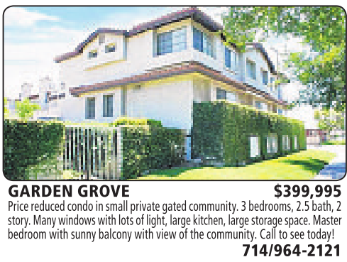 GARDEN GROVE $399,995 Price reducedcondo in small private gated community. 3bedrooms, 2.5bath, 2 story. Manywindows with lots of light, large kitchen, large storagespace.Master bedroomwithsunnybalcony with view of thecommunity.Calltosee today! 714/964-2121 See also