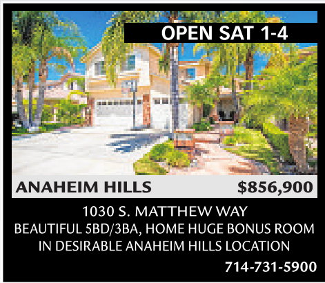 1030 S. MATTHEWWAY BEAUTIFUL 5BD/3BA, HOME HUGE BONUS ROOM IN DESIRABLE ANAHEIM HILLS LOCATION 714-731-5900