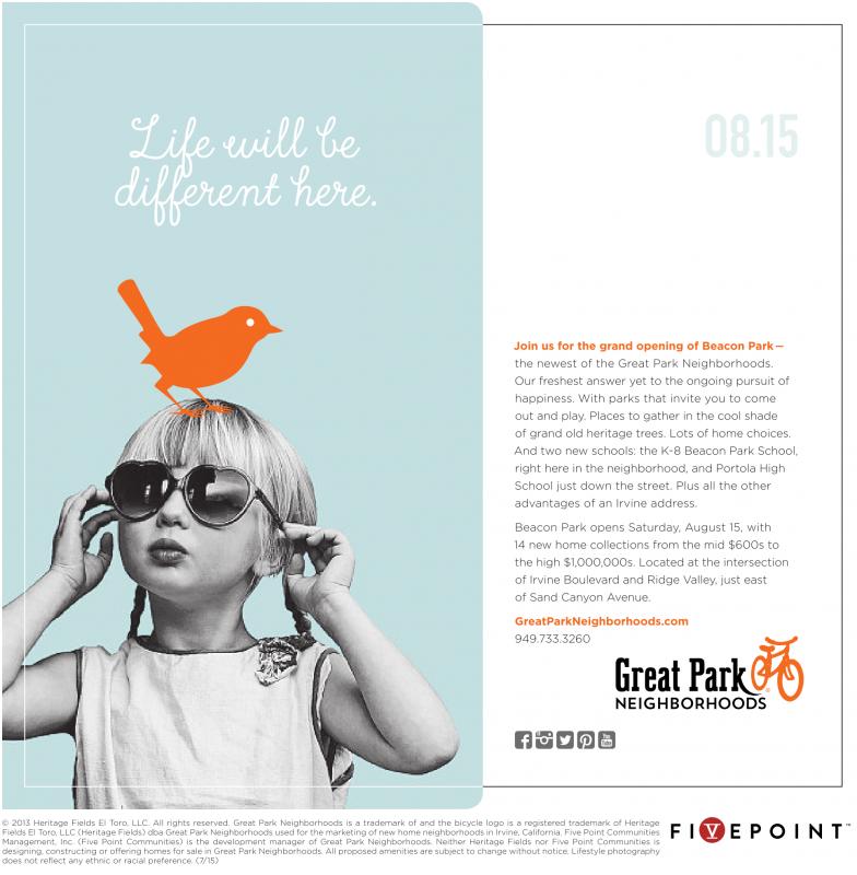 Management, Inc. (Five Point Communities) is the development manager of Great Park Neighborhoods. Neither Heritage Fields nor Five Point Communities is designing, constructing or offering homes for sale inGreat Park Neighborhoods. All proposed amenities are subject to change without notice. Lifestyle photography does not reflect any ethnic or racial preference. (7/15)