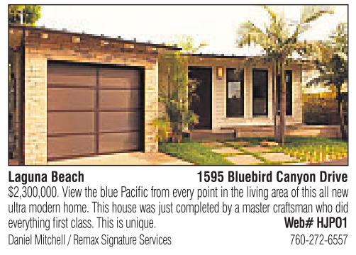 Laguna Beach 1595 Bluebird Canyon Drive $2,300,000. View theblue Pacific from every pointinthe living area of this allnew ultra modern home. This housewas just completed by amaster craftsman whodid everything first class. This is unique. Web# HJPO1 Daniel Mitchell /Remax SignatureServices 760-272-6557
