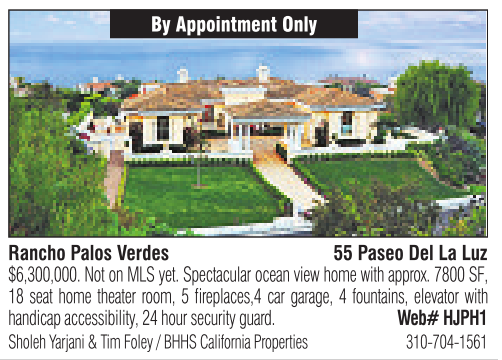 Rancho Palos Verdes By Appointment Only 55 Paseo Del La Luz $6,300,000.Not on MLS yet. Spectacular ocean view homewithapprox. 7800 SF, 18 seat home theater room, 5fireplaces,4 car garage, 4fountains, elevator with handicap accessibility,24hour security guard. Web# HJPH1 Sholeh Yarjani&TimFoley /BHHS California Properties 310-704-1561