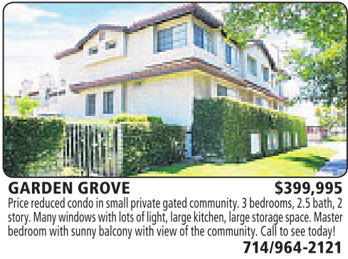 GARDEN GROVE $399,995 Price reducedcondo in small private gated community. 3bedrooms, 2.5bath, 2 story. Manywindows with lots of light, large kitchen, large storagespace.Master bedroomwithsunnybalcony with view of thecommunity.Calltosee today! 714/964-2121 See also