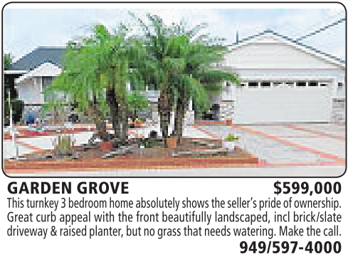 GARDEN GROVE $599,000 This turnkey3bedroomhome absolutely showsthe seller’s prideofownership. Great curb appeal with the front beautifully landscaped, incl brick/slate driveway&raised planter,but no grassthatneeds watering. Makethe call.