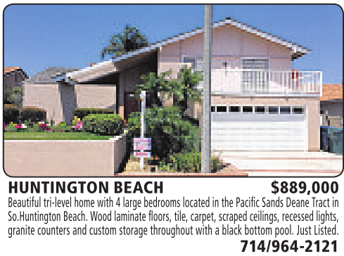HUNTINGTON BEACH $889,000 Beautiful tri-level home with 4large bedrooms located inthe Pacific Sands Deane Tract in So.Huntington Beach. Wood laminate floors, tile, carpet, scraped ceilings, recessed lights, granite counters and custom storage throughout with ablack bottom pool. Just Listed.