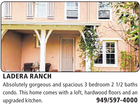 LADERA RANCH Absolutely gorgeous and spacious 3 bedroom 2 1/2 baths condo. This home comes with aloft, hardwood floors and an upgraded kitchen. 949/597-4000
