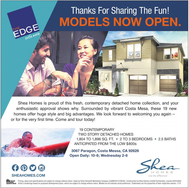Thanks For Sharing The Fun! MODELS NOW OPEN. Shea Homes is proud of this fresh, contemporary detached home collection, and your enthusiastic approval shows why. Surrounded by vibrant Costa Mesa, these 19 new homes offer huge style and big advantages. We look forward to welcoming you again – 19 CONTEMPORARY TWO STORY DETACHED HOMES 1,804 TO 1,896 SQ. FT. • 2 TO 3 BEDROOMS • 2.5 BATHS ANTICIPATED FROM THE LOW $800s 3067 Paragon, Costa Messa, CA 92626 Open Daily: 10-6; Wednesday 2-6 SHEAHOMES.COM Pricing, plans and specifications are subjecttochange withoutnotice. Sales by Shea Homes® Marketing Company (CalBRE#01378646), ConstructionbySheaHomes Limited Partnership,License [#855368]. Artist’srenderings based on proposed developmentplans, which are subjecttochange withoutnotice.Models do notindicateracial preference.Trademarksare the properties of theirrespectiveowners. 7/15