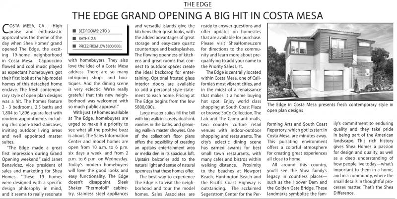 MEsA, CA - High praise and enthusiastic approval was the theme of the day when shea Homes’ grand opened The Edge, the exciting 19-home neighborhood in Costa Mesa. Cappuccino flowed and cool music played as expectant homebuyers got theirfirst lookatthe hip model homes of this detached home enclave. The fresh contemporary style of open plan designs was a hit. The homes feature 2 - 3 bedrooms, 2.5 baths and 1,804 to 1,896 square feet with modern appointments including chic open-tread staircases, inviting outdoor living areas and well appointed master suites.