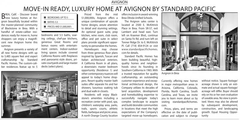 Calif. - Discover brand new luxury homes at Avignon beautifully located within the master-planned community of Blackstone in Brea. With a handful of estate-caliber residences ready for move-in, home shoppers can enjoy a magnificent new Avignon home this summer.
