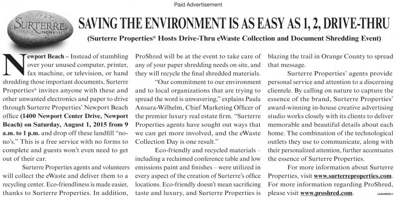 Beach – Instead of stumbling over your unused computer, printer, fax machine, or television, or hand shredding those important documents, Surterre Properties ® invites anyone with these and other unwanted electronics and paper to drive through Surterre Properties’ Newport Beach office (1400 Newport Center Drive, Newport Beach) on Saturday, August 1, 2015 from 9 a.m. to 1 p.m. and drop off these landfill “nono’s.” This is a free service with no forms to complete and guests won’t even need to get out of their car.