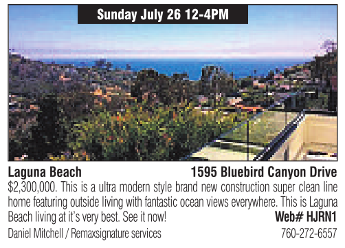 Laguna Beach Sunday July 26 12-4PM 1595 Bluebird Canyon Drive $2,300,000. This is aultra modern style brand new construction super clean line home featuringoutside living with fantasticocean viewseverywhere. This is Laguna Beach livingatit’svery best.See it now! Web# HJRN1 Daniel Mitchell /Remaxsignatureservices 760-272-6557