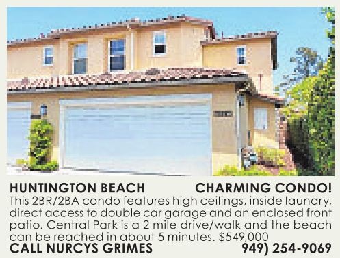 HUNTINGTON BEACH CHARMING CONDO! This2BR/2BA condo features high ceilings, insidelaundry, direct access to double cargarageand an enclosedfront patio. Central Park is a2mile drive/walk and the beach can bereached in about 5minutes. $549,000 CALL NURCYS GRIMES 949) 254-9069