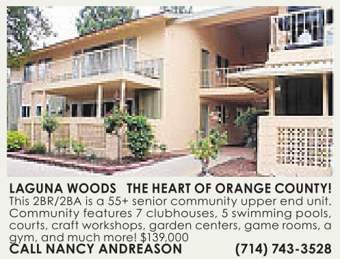LAGUNA WOODS THE HEART OFORANGE COUNTY! This 2BR/2BA is a55+ senior community upper end unit. Community features 7clubhouses, 5swimming pools, courts, craft workshops, garden centers, game rooms, a gym, and much more! $139,000 CALL NANCY ANDREASON (714) 743-3528