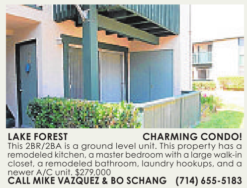 LAKE FOREST CHARMING CONDO! This 2BR/2BA isaground level unit. This property has a remodeledkitchen,amaster bedroomwith alarge walk-in closet, aremodeled bathroom, laundry hookups, and a newer A/C unit. $279,000 CALL MIKE VAZQUEZ &BOSCHANG (714) 655-5183