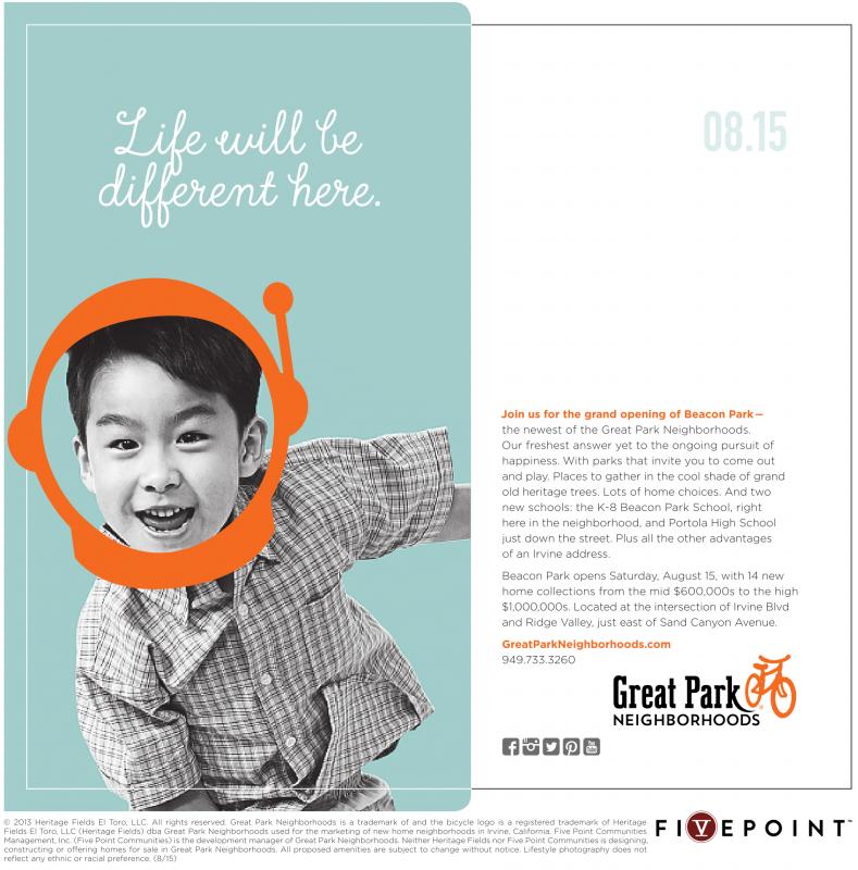 Life will be different here. 08.15 Join us for the grand opening of Beacon Park — the newest of the Great Park Neighborhoods. Our freshest answer yet to the ongoing pursuit of happiness. With parks that invite you to come out and play. Places to gather in the cool shade of grand old heritage trees. Lots of home choices. And two new schools: the K-8 Beacon Park School, right here in the neighborhood, and Portola High School just down the street. Plus all the other advantages of an Irvine address. Beacon Park opens Saturday, August 15, with 14 new home collections from the mid $600,000s to the high $1,000,000s. Located at the intersection of Irvine Blvd and Ridge Valley, just east of Sand Canyon Avenue. GreatParkNeighborhoods.com 949.733.3260 © 2013 Heritage Fields El Toro, LLC. All rights reserved. Great Park Neighborhoods is a trademark of and the bicycle logo is a registered trademark of Heritage Fields El Toro, LLC (Heritage Fields) dba Great Park Neighborhoods used for the marketing of new home neighborhoods in Irvine, California. Five Point Communities Management, Inc. (Five Point Communities) is the development manager of Great Park Neighborhoods. Neither Heritage Fields nor Five Point Communities is designing, constructing or offering homes for sale in Great Park Neighborhoods. All proposed amenities are subject to change without notice. Lifestyle photography does not reflect any ethnic or racial preference. (8/15)