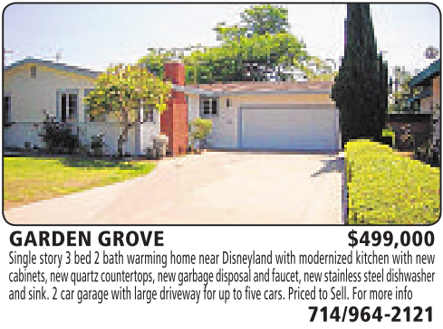 GARDEN GROVE $499,000 Single story 3bed 2bath warming home near Disneyland with modernized kitchen with new cabinets, new quartz countertops,new garbage disposal andfaucet, new stainless steel dishwasher andsink. 2car garagewithlarge drivewayfor up to fivecars. Priced to Sell.For moreinfo 714/964-2121