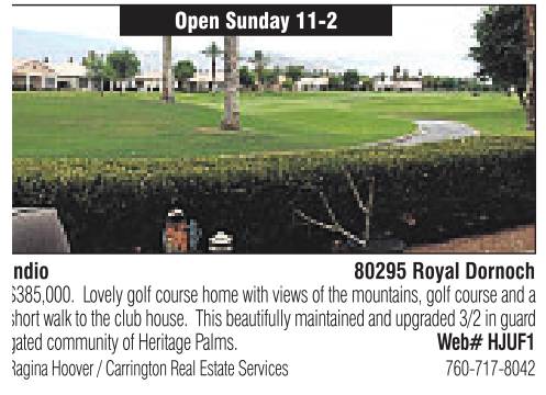 Indio Open Sunday 11-2 80295 Royal Dornoch $385,000. Lovely golf course home with views of the mountains, golf course anda short walk to the club house. This beautifullymaintained andupgraded 3/2 in guard gated community of Heritage Palms. Web# HJUF1 Ragina Hoover /Carrington Real Estate Services 760-717-8042