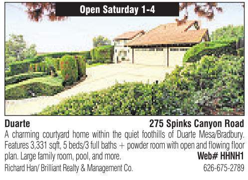 Duarte Open Saturday 1-4 275 Spinks Canyon Road RichardHan/Brilliant Realty &Management Co. 626-675-2789 A charming courtyard home within the quiet foothills of Duarte Mesa/Bradbury. Features 3,331 sqft, 5beds/3 full baths +powder room with open and flowing floor plan. Largefamily room, pool, andmore. Web# HHNH1