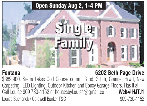 Fontana Open Sunday Aug 2, 1-4 PM 6202 Beth Page Drive $389,900. Sierra Lakes Golf Course comm. 3 bd, 3 bth, Granite, Hrwd, New Carpeting, LED Lighting, OutdoorKitchen and EpoxyGarage Floors. Has It all! Call Louise 909 730-1152 or housesbyLouise@gmail.co Web# HJTJ1 Louise Suchanek/Coldwell Banker T&C 909-730-1152