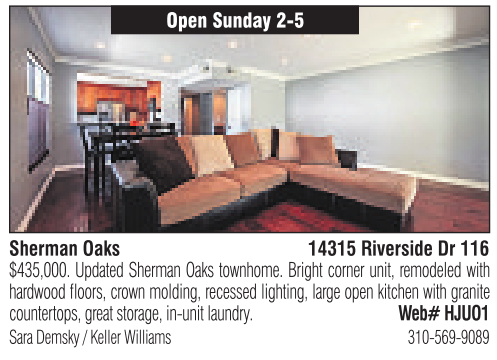 Open Sunday 2-5 Sherman Oaks 14315 Riverside Dr 116 Sara Demsky /Keller Williams 310-569-9089 hardwood floors, crown molding, recessed lighting, large open kitchen with granite $435,000. Updated Sherman Oaks townhome. Bright corner unit, remodeled with countertops, greatstorage, in-unit laundry. Web# HJUO1