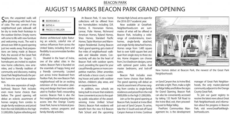 Join us forthe grand opening at Beacon Park,locatedatIrvine Blvd. just eastofSand canyon. To arrive, take the I-5 South and exit off Sand canyon AvenueinIrvine.continue