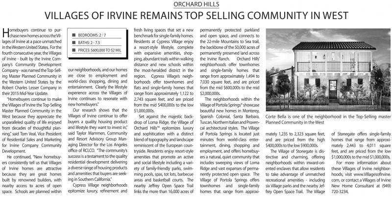 “homebuyers continue to make theVillages of Irvine the Top-Selling Master Planned community in the West because they appreciate the unparalleled quality of life enjoyed from decades of thoughtful planning,” said Tom Veal, Vice President of residential Sales and Marketing for Irvine company community development.