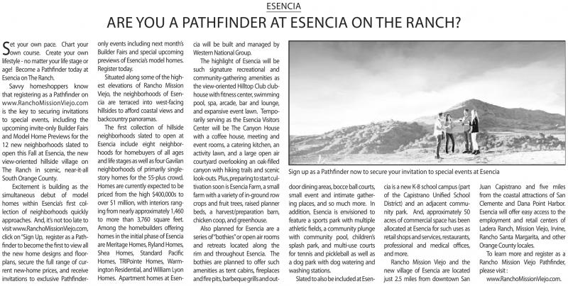 Excitement is building as the simultaneous debut of model homes within Esencia’s first collection of neighborhoods quickly approaches. And,it’snot toolateto visit www.ranchoMissionViejo.com, click on“Signup, register as aPathfinder to become the first to view all the new home designs and floorplans, secure the full range of current new-home prices, and receive invitations to exclusive Pathfinder-