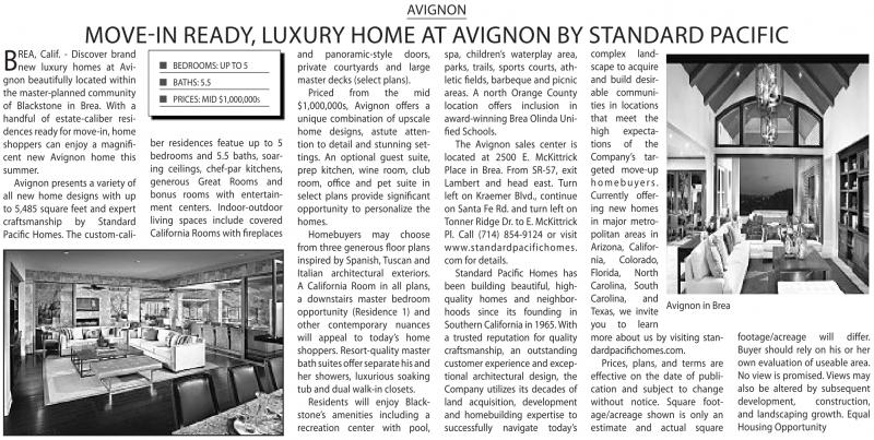 Calif. - Discover brand new luxury homes at Avignon beautifully located within the master-planned community of Blackstone in Brea. With ahandful of estate-caliber residences ready formove-in, home shoppers can enjoy a magnificent new Avignon home this summer.