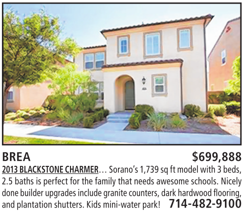 BREA $699,888 2013 BLACKSTONE CHARMER…Sorano’s1,739 sq ft modelwith3beds, 2.5 baths is perfect for the family that needs awesome schools. Nicely done builderupgrades include granitecounters,darkhardwoodflooring, andplantationshutters. Kids mini-waterpark! 714-482-9100