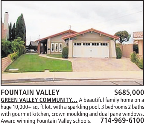 huge 10,000+sq. ft lot. with asparkling pool. 3bedrooms2baths with gourmetkitchen,crown moulding and dual pane windows. Award winningFountain Valley schools. 714-969-6100