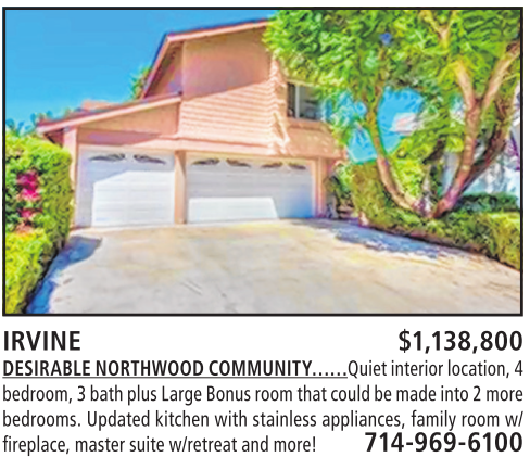 IRVINE $1,138,800 DESIRABLENORTHWOOD COMMUNITY……Quietinterior location,4 bedroom, 3bathplusLarge Bonus room that couldbemadeinto 2more bedrooms. Updated kitchen with stainless appliances, family room w/ fireplace,master suite w/retreat andmore! 714-969-6100