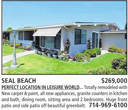 SEAL BEACH $269,000 PERFECTLOCATION IN LEISUREWORLD... Totallyremodeledwith Newcarpet&paint,all new appliances, granitecounters in kitchen and bath, dining room, sitting area and 2bedrooms. Huge front patioand side patiooff beautifulgreenbelt. 714-969-6100