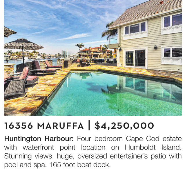 Huntington Harbour: Four bedroom Cape Cod estate with waterfront point location on Humboldt Island. Stunning views, huge, oversized entertainer’s patio with pool and spa. 165 foot boat dock.