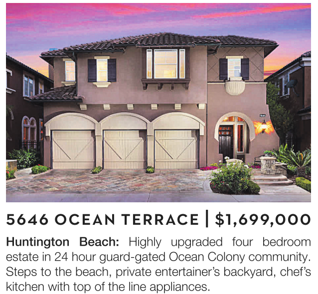 Huntington Beach: Highly upgraded four bedroom estate in 24 hour guard-gated Ocean Colony community. Steps to the beach, private entertainer’s backyard, chef’s kitchen with top of the line appliances.