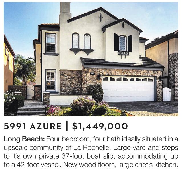 Long Beach: Four bedroom, four bath ideally situated in a upscale community of La Rochelle. Large yard and steps to it’s own private 37-foot boat slip, accommodating up to a 42-foot vessel. New wood floors, large chef’s kitchen.