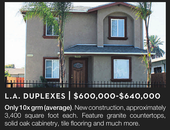 Only 10x grm (average).New construction, approximately 3,400 square foot each. Feature granite countertops, solid oak cabinetry, tile flooring and much more.