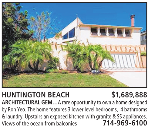 HUNTINGTON BEACH $1,689,888 ARCHITECTURAL GEM…Arareopportunity to ownahome designed by RonYeo.The home features 3lower level bedrooms, 4bathrooms &laundry.Upstairs an exposed kitchen with granite &SSappliances. Viewsofthe ocean from balconies 714-969-6100
