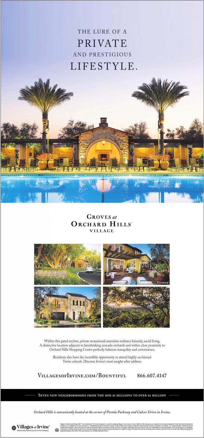 JS2 SUNDAY, AUGUST 9, 2015 OC LOS ANGELES TIMES T H E L U R E O F A P R I VAT E A N D P R E S T I G I O U S L I F E S T Y L E . Vicenza Amelia Within this gated enclave, private recreational amenities embrace leisurely, social living. A distinctive location adjacent to breathtaking avocado orchards and within close proximity to Orchard Hills Shopping Center perfectly balances tranquility and convenience. Residents also have the incredible opportunity to attend highly-acclaimed Tustin schools. Discover Irvine’s most sought-after address. VillagesofIrvine.com/Bountiful 866.607.4147 Seven new neighborhoods from the mid $1 millions to over $2 million Orchard Hills is conveniently located at the corner of Portola Parkway and Culver Drive in Irvine. Villages of Irvine® and Orchard Hills™ are trademarks of The Irvine CompanyLLC,used for marketing villages of new homes in Irvine, California USA. Allprojects areinplanned communities developed by Irvine Community Development CompanyLLC,anaffiliateofThe Irvine CompanyLLC.“Masterfully Planned by The Irvine Company” means thatthe Irvine Companycreated themaster land plan for all Irvine Companycommunities. The “master land plan” includes the overall entitlement and design of each community but does not include the design, construction and sale of homes. Thedesign,construction and sale of homes is the sole responsibility of community builders. TheIrvine Companyisnot designing, constructing or offering homes for sale in anycommunity.Amenities, plans, pricing and product illustrations are subject to change.The Resort at the Groves exclusively serves residents within the Groves at OrchardHills.Model photography for illustrative purposes only.©2015 The Irvine CompanyLLC.All Rights Reserved. 8/2015