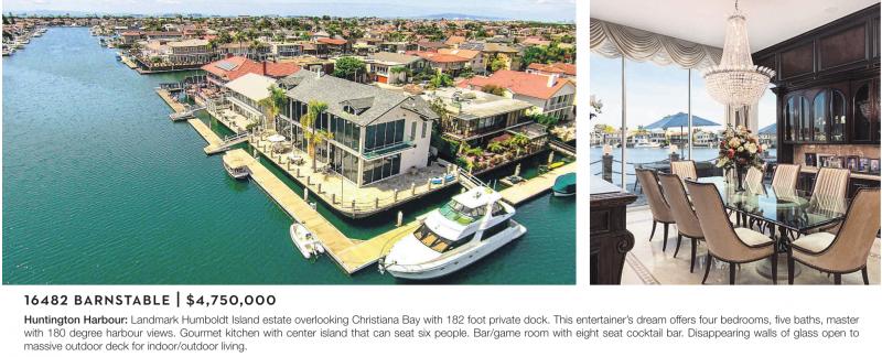 Huntington Harbour: Landmark Humboldt Island estate overlooking Christiana Bay with 182 foot private dock. This entertainer’s dream offers four bedrooms, five baths, master with 180 degree harbour views. Gourmet kitchen with center island that can seat six people. Bar/game room with eight seat cocktail bar. Disappearing walls of glass open to massive outdoor deck for indoor/outdoor living.
