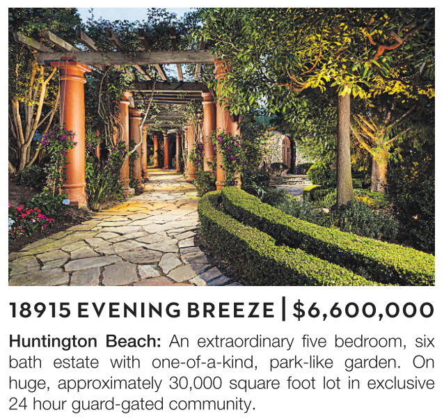 Huntington Beach: An extraordinary five bedroom, six bath estate with one-of-a-kind, park-like garden. On huge, approximately 30,000 square foot lot in exclusive 24 hour guard-gated community.