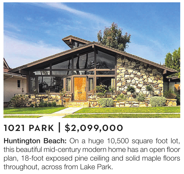 Huntington Beach: On a huge 10,500 square foot lot, this beautiful mid-century modern home has an open floor plan, 18-foot exposed pine ceiling and solid maple floors throughout, across from Lake Park.